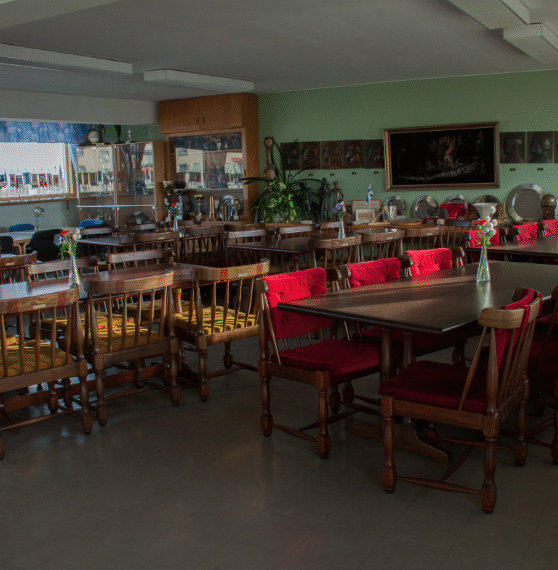 Yläkerrassa on istumapaikat ja astiasto noin 50 henkilölle ja keittiö.